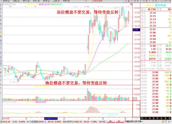 这一口诀的内容包括了诀一中“横盘不交易”的内容,但主要的意思是说,当一只股票或者权证持续上涨或者下跌了一段时间后就进入了横盘状态,此时不必在高位全仓卖出,也不必在低位全仓买进,因为盘整之后就会变盘,故盘整时期不可主观决定建仓或清仓。如果是高位向下变,则及时清仓,不会有损失;如果是低位向高变,及时追进,也不会踏空 。