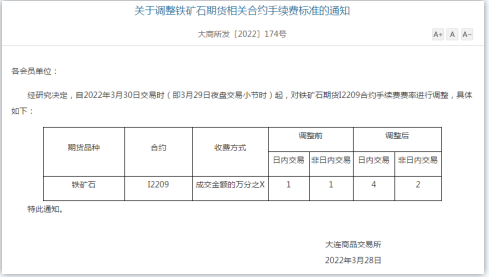 经研究决定,自2022年3月30日交易时(即3月29日夜盘交易小节时)起,对铁矿石期货I2209合约手续费费率进行调整,具体如下: