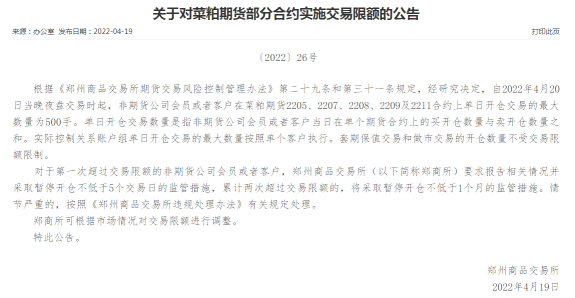 根据《郑州商品交易所期货交易风险控制管理办法》第二十九条和第三十一条规定,经研究决定,自2022年4月20日当晚夜盘交易时起,非期货公司会员或者客户在菜粕期货2205、2207、2208、2209及2211合约上单日开仓交易的最大数量为500手。单日开仓交易数量是指非期货公司会员或者客户当日在单个期货合约上的买开仓数量与卖开仓数量之和。实际控制关系账户组单日开仓交易的最大数量按照单个客户执行。套期保值交易和做市交易的开仓数量不受交易限额限制。