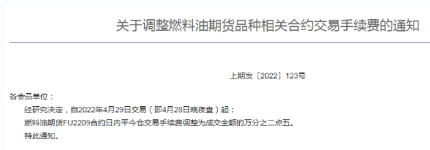 燃料油期货FU2209合约日内平今仓交易手续费调整为成交金额的万分之二点五。