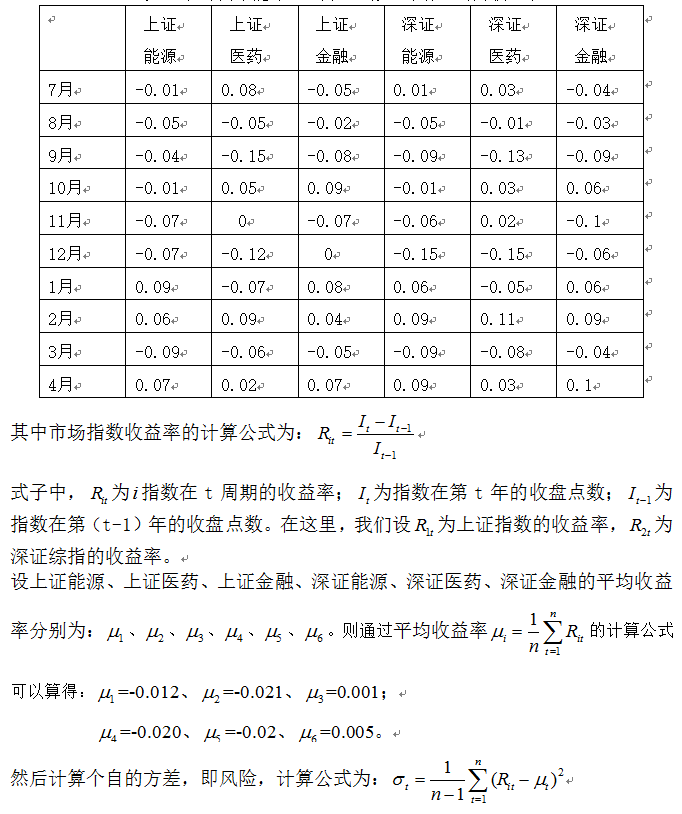 为了研究Markowitz资产组合理论在我国证券市场上的作用空间,我们选取从11年7月到今年4月总共10个月时间的上证和深证在能源、医药和金融三方面的指数月收益率进行实证研究。原因是:第一,Markowitz资产组合理论演算复杂,计算量大,我们只选取三个行业进行举例研究;第二,这三个行业已经包含了我国A股市场不少比例的股票,能够在一定程度上分别指示出上证和深证股市的运行情况;第三,由于各方面原因,A股市场去年表现一直不佳,从7月份到过年期间都是熊市下跌,而从年后经过盘整后到今天有了小幅的反弹。研究的这段时间区间中既有上涨又有下跌和调整。故选择这个时间段拿来研究是比较合理的。我们通过方正证券泉友通软件中可以获得每个月的收盘值,导入Excel软件可以算出月收益率。如表一所示: