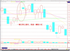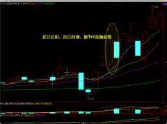 口诀十六:一根巨阳上影长,收盘一瞬抢入忙。 这一诀是继十四诀的进一步说明。如果这根特大的阳线出现了长长的上影,尾盘有获利盘涌出,(有时也是大盘的尾市突然变盘影响)上影超过了K线实体,或者至少也有当日升幅的三四个点以上,那么在分时线尾盘跳水收...
