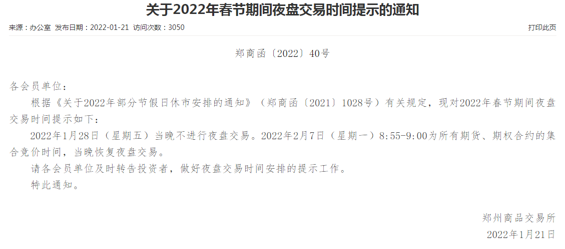 根据《关于2022年部分节假日休市安排的通知》(郑商函〔2021〕1028号)有关规定,现对2022年春节期间夜盘交易时间提示如下: