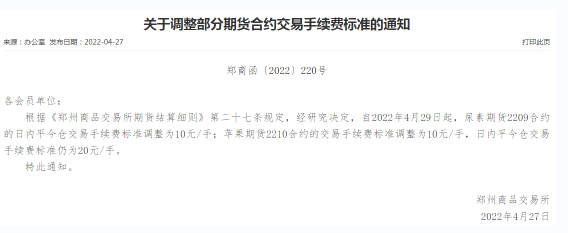 根据《郑州商品交易所期货结算细则》第二十七条规定,经研究决定,自2022年4月29日起,尿素期货2209合约的日内平今仓交易手续费标准调整为10元/手;苹果期货2210合约的交易手续费标准调整为10元/手,日内平今仓交易手续费标准仍为20元/手。