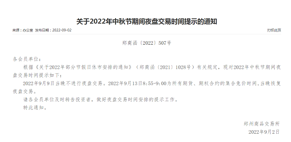 各大交易所对2022年中秋节期间夜盘交易时间提示如下: